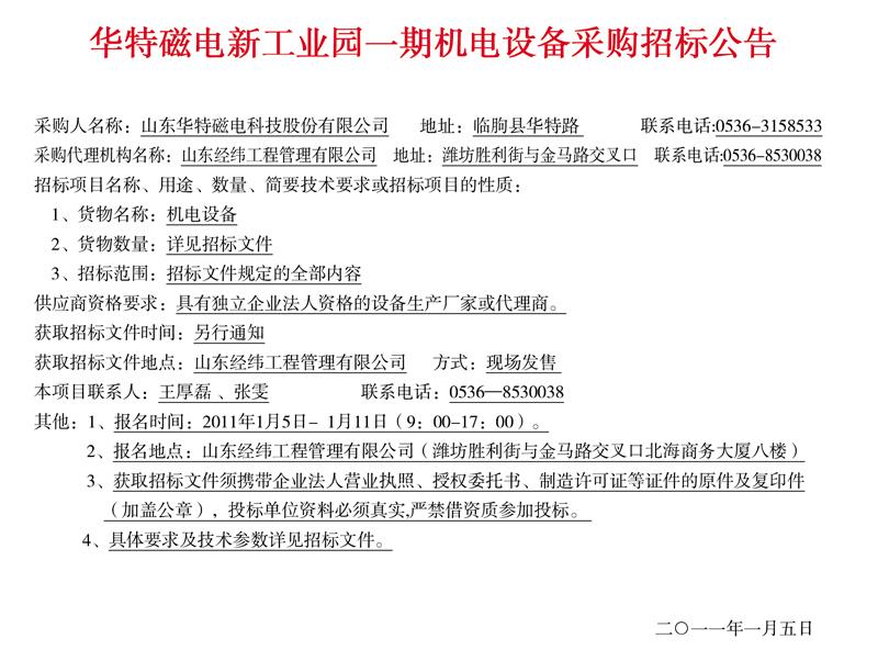 金莎9001zz以诚为本磁电新工业园一期机电设备采购招标公告