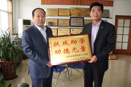 教中心刘兆军校长与公司董事长兼总经理王兆连合影。 5月13日,公司为特殊教育中心学校捐助款项, 24日上午,特殊教育中心学校校长刘兆军等领导来公司赠送匾牌,并对公司的善举表示感谢。